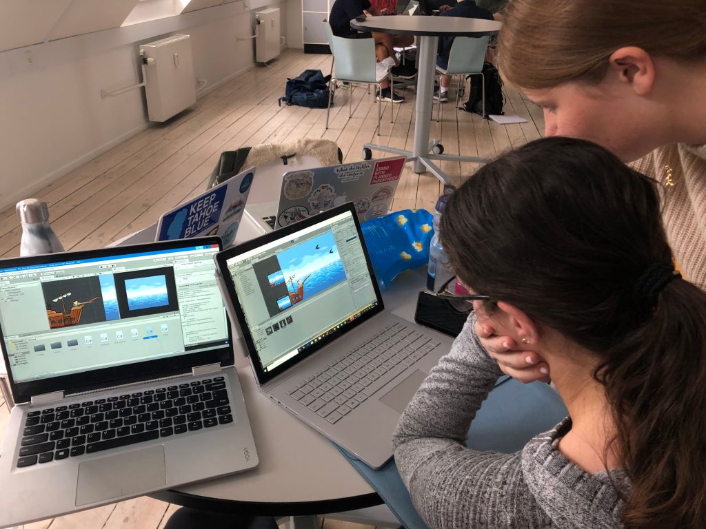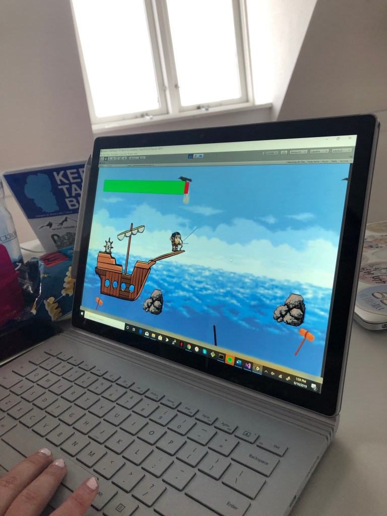 Thankfully, building a game has many components, and since this wasn’t for a grade and was just for fun and playing around with the engine, we were able to relax and have fun instead of worrying about the intricacies of programming. My group came up with a 2D scroller game built around a viking theme – because we were an all-female group, we leaned into the girl power and created Viqueens. The game is relatively simple and involves a scrolling ship with a female captain shooting birds and rocks to avoid damaging the ship.
